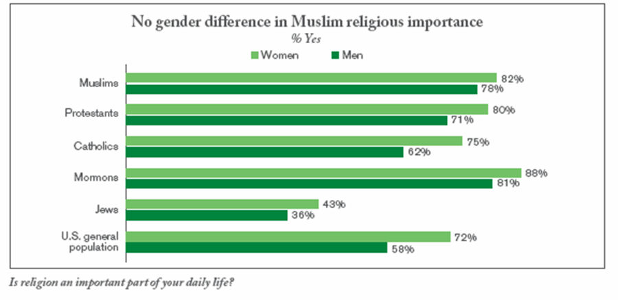 ஆக, அமெரிக்காவை பொறுத்தவரை மார்க்கப்பற்று என்பது ஆண்களை விட பெண்களுக்கே அதிகமுள்ளது. ஆனால் முஸ்லிம் அமெரிக்கர்களை பொறுத்தவரை இந்த வித்தியாசம் இல்லாமல் இருபாலரும் கிட்டத்தட்ட சமமான நிலையிலேயே உள்ளனர்.